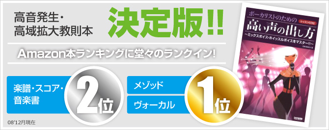 『高い声が出ない!!』『もっとハイトーンで歌えるようになりたい!!』『大好きな曲のキーを下げずに歌いたい!!』そんな貴方にお勧めな教則本が(株)ドレミ楽譜出版社より発売中のボーカリストのための高い声の出し方~ミックスボイス・ホイッスルボイスをマスター!!~です。